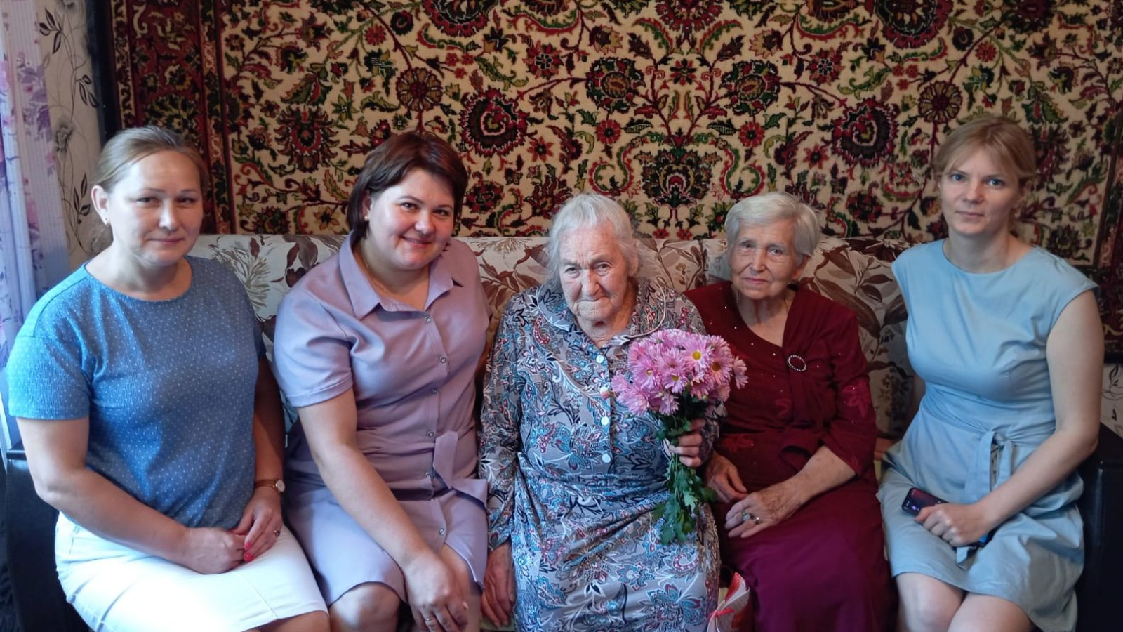 Аны туган көне белән котларга социаль яклау бүлеге начальнигы Алина Матвеева, халыкка социаль хезмәт күрсәтү үзәге директоры Наташа Сигаева, өйдәге бүлекнең социаль эш буенча белгече Ольга Платончева килде. Кунаклар аңа ныклы сәламәтлек, иминлек, күтәренке кәеф теләделәр, чәчәкләр һәм истәлекле бүләк тапшырдылар.