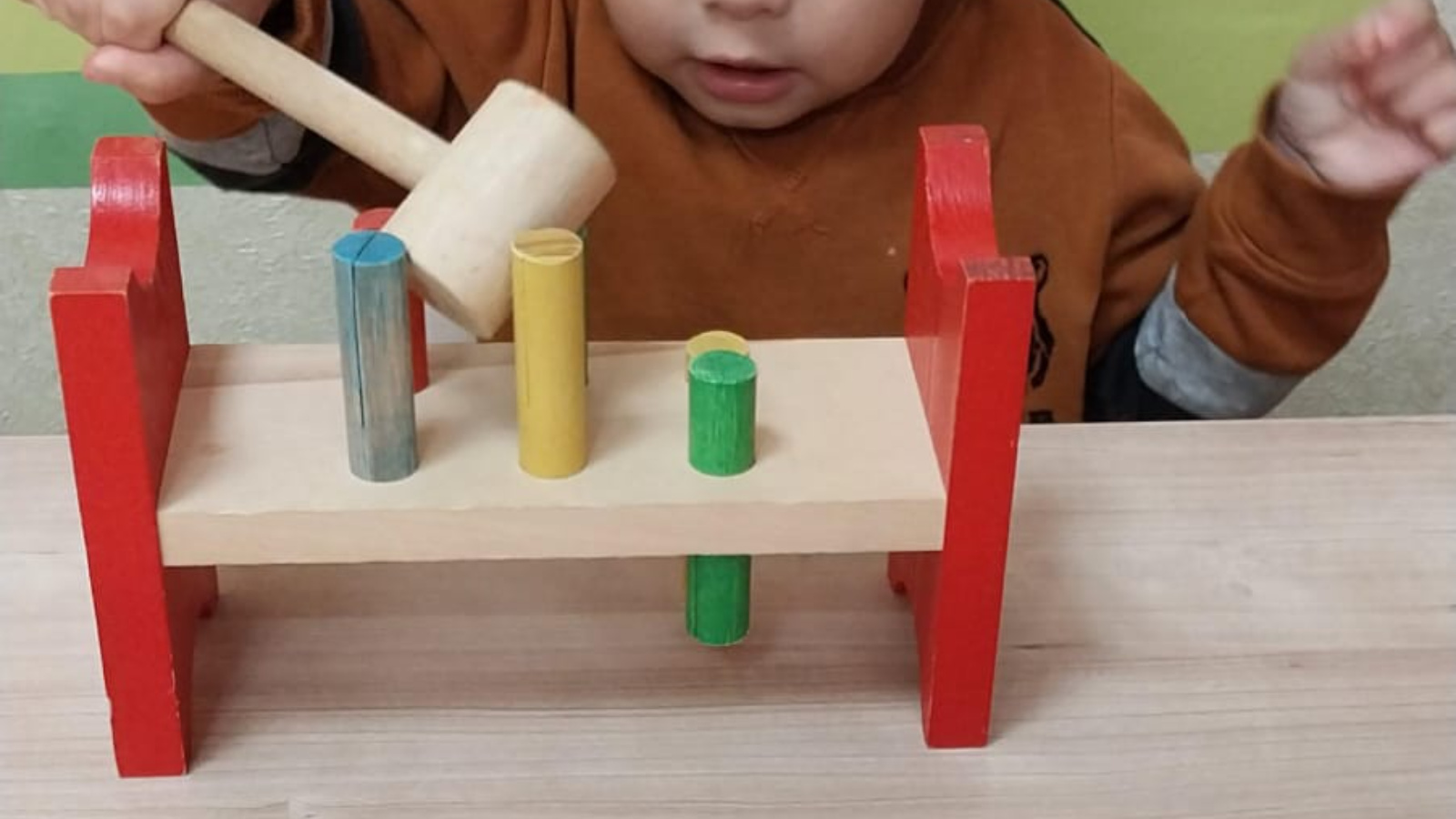 Шундый материалларның берсе – «Шакылдату» уен әсбабы. Уен вакытында бала төсле казыкларга суга һәм «тук-тук» авазын әйтә. Шакылдату хәрәкәтләрнең төгәллеген, күрү-мотор координациясен, төсләрне кабул итүне, сәбәп-нәтиҗә бәйләнешләрен аңлауны үстерүгә ярдәм итә.