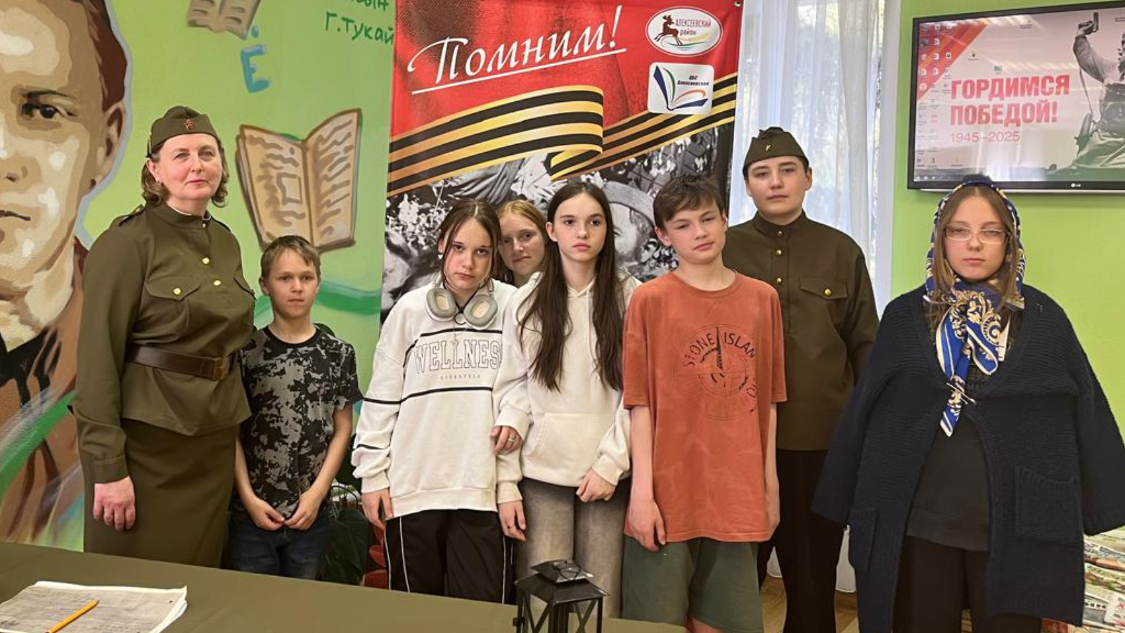 28 апрельдә Алексеевск районының «Кайгырту» балалар һәм яшүсмерләр өчен социаль приютында тәрбияче Венера Халикова белән бергә үзәк китапханәдә булдылар, анда Җиңүнең 80 еллыгы кысаларында «Үз геройларыбыз» библиотөне узды.