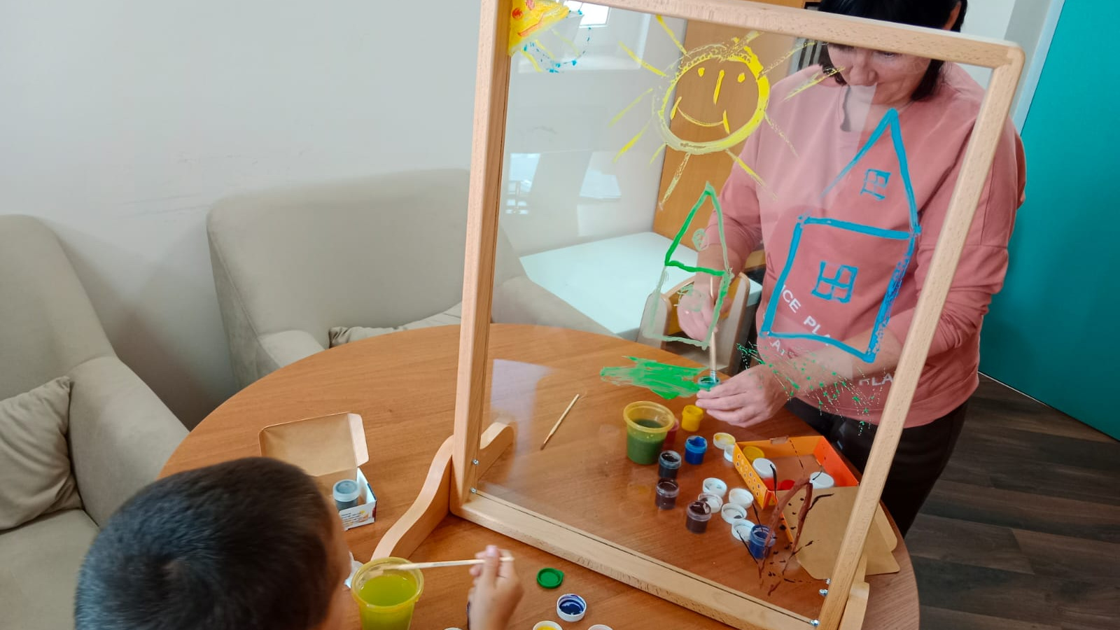 Эштә үтә күренмәле мольберт белән арт-терапевтик комплекс кулланылды, ул гаилә белән эшләү өчен уникаль корал булып тора. Рәсем ясау барышында балаларда коммуникатив күнекмәләр формалаша, вак моторика үсә, куркулар бетә, үз-үзеңә ышаныч үсә. Ата-ананың психологик киртәләре бетә, бала белән нәтиҗәле аралашу күнекмәләре үсә. Үзара хезмәттәшлекнең уңай тәҗрибәсе буларак уртак рәсем барлыкка килә.