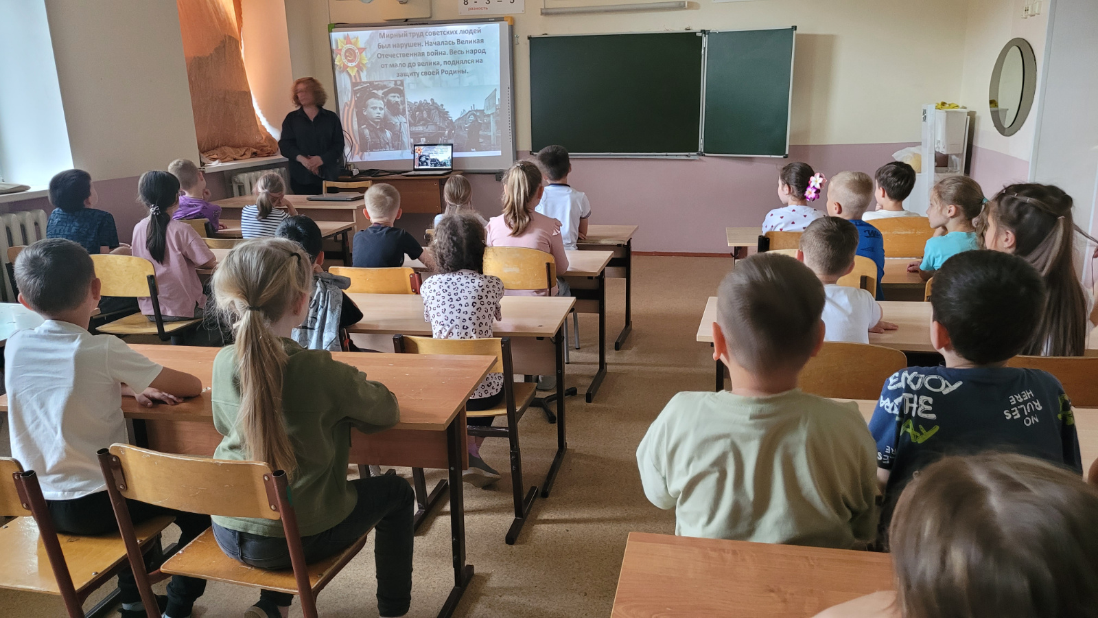 Дәреснең максаты – ватанпәрвәрлек һәм гражданлык җаваплылыгы хисләрен формалаштыру. Социаль педагог катнашучыларга 84 ел элек башланган вакыйгалар турында сөйләде. Хикәя Бөек Ватан сугышының мөһим чаралары турында презентация белән үрелеп барды.