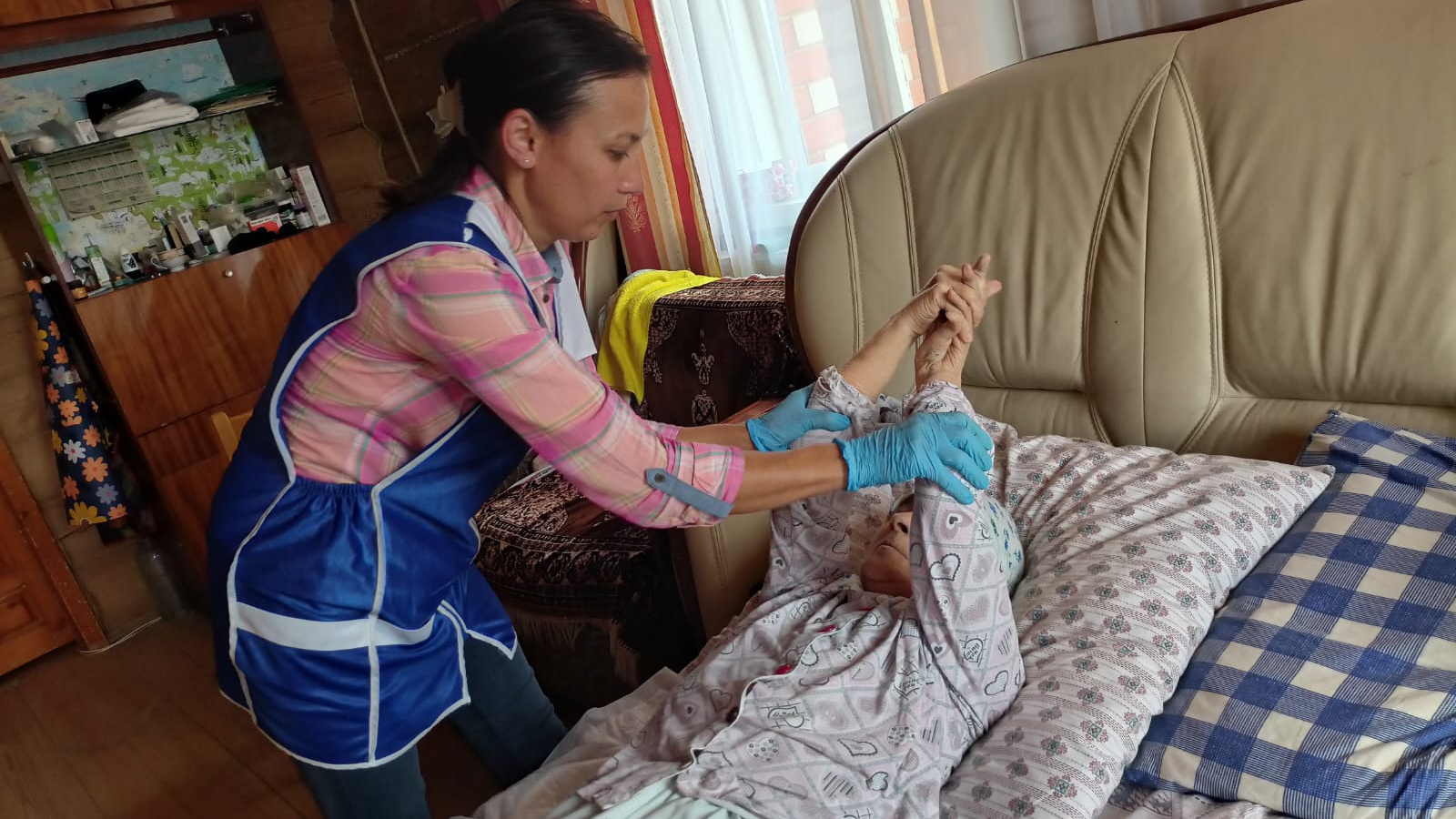 Социаль хезмәткәр Гөлсинә Хәсәншина ишемик инсульттан соң сул ягы зарарланган әби белән пассив һәм актив гимнастика үткәрә. Системалы тернәкләндерү чаралары нәтиҗәсендә өлкән яшьтәге хатын-кызның үз көченә ышанычы барлыкка килде, психоэмоциональ хәле яхшырды.