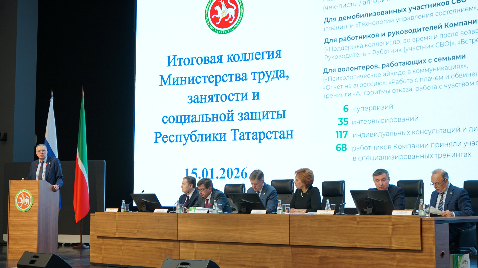 Министр Эльмира Зарипова үз чыгышында ведомствоның 2025 елда эш нәтиҗәләре, Татарстанның хезмәт базарындагы вәзгыять, гражданнарга, шул исәптән махсус хәрби операциядә катнашучыларның гаиләләренә социаль ярдәм чаралары, ярлылыкка каршы көрәш, «Гаилә» илкүләм проектын гамәлгә ашыру нәтиҗәләре турында сөйләде. Шулай ук коррупциягә каршы тору мәсьәләләре һ. б. да яктыртылды.