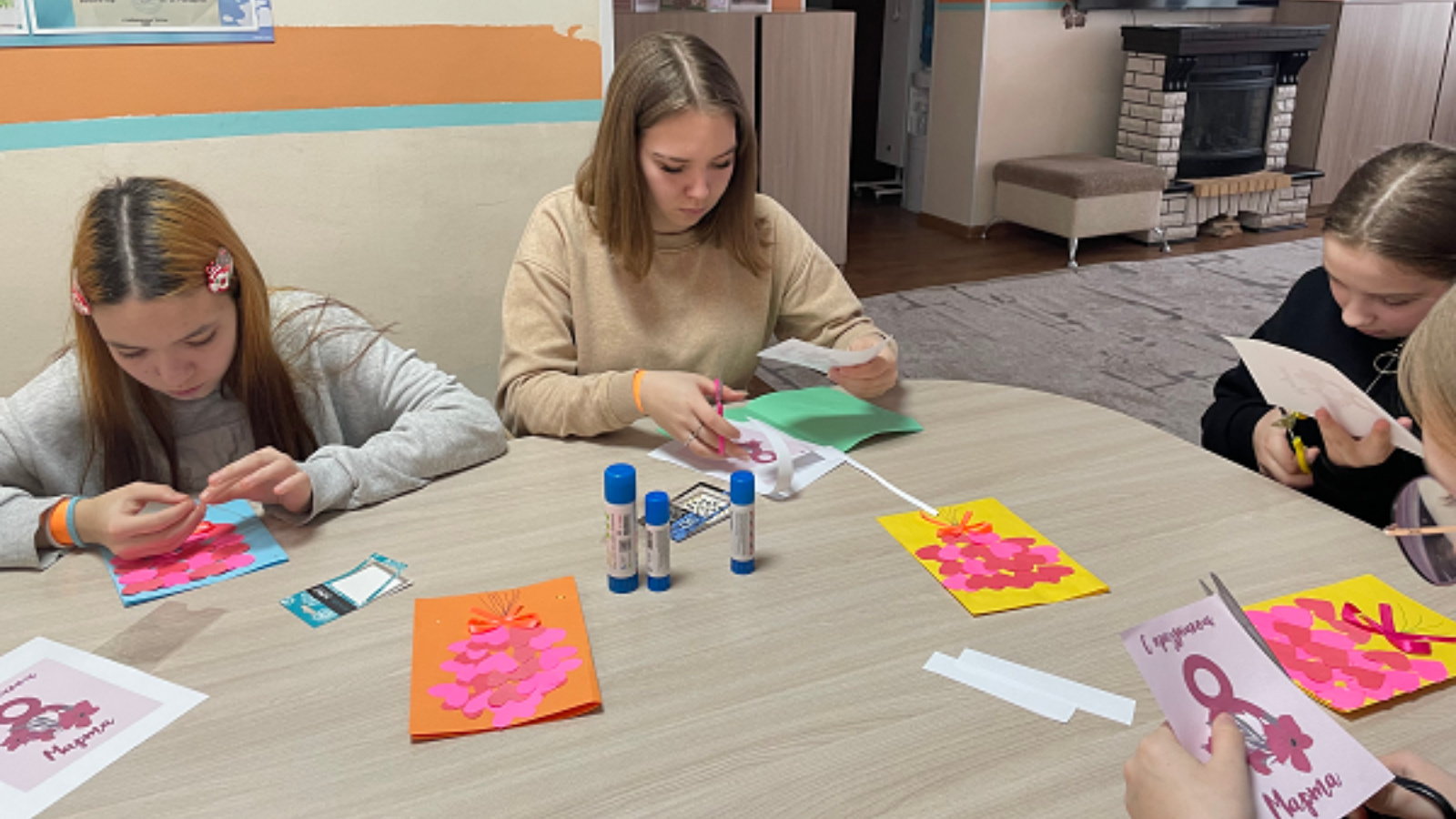 Халыкара хатын-кызлар көне алдыннан Менделеевск районының «Кама таңнары» балалар һәм яшүсмерләр социаль приютында котлау открыткалары ясау буенча мастер-класс узды.